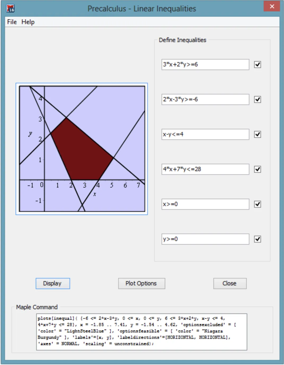 У вікні Precalculus – Linear Inequalities, що з’явилося, праворуч слід ввести обмеження і натиснути на кнопку Display. У результаті зліва з’явиться область допустимих рішень, а внизу команда системи Maple, за допомогою якої було здійснено побудову. За необхідності можна натиснути на кнопку Plot Options і внести зміни для побудованої ОДР.