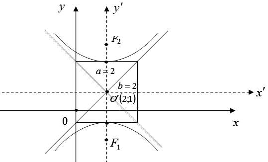 Це рівняння гіперболи, центр якої розташований в точці $$O^{\prime}(2;1)$$. Оскільки півосі дорівнюють $$a=b=2$$, то це рівностороння гіпербола, дійсна (фокальна) вісь якої направлена по $$O^{\prime}y^{\prime}$$. На ній розташовані фокуси $$F_1$$ і $$F_2$$ на віддалі $$c=\sqrt{a^2+b^2}=2\sqrt{2}$$ від центра $$O^{\prime}$$. Значить, нові координати фокусів $$x^{\prime}=0,\; y^{\prime}=\pm2\sqrt{2}$$. На основі формул паралельного перенесення запишемо старі координати фокусів: $$F_1(2;1-2\sqrt{2}),\;F_2(2;1+2\sqrt{2}).$$