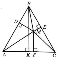 $$\frac{1}{2}AC \cdot BK=$$ $$\frac{1}{2}AC \cdot MF+$$ $$\frac{1}{2}AB \cdot MD+$$ $$\frac{1}{2}$$ $$BC$$ $$\cdot$$ $$ME =$$