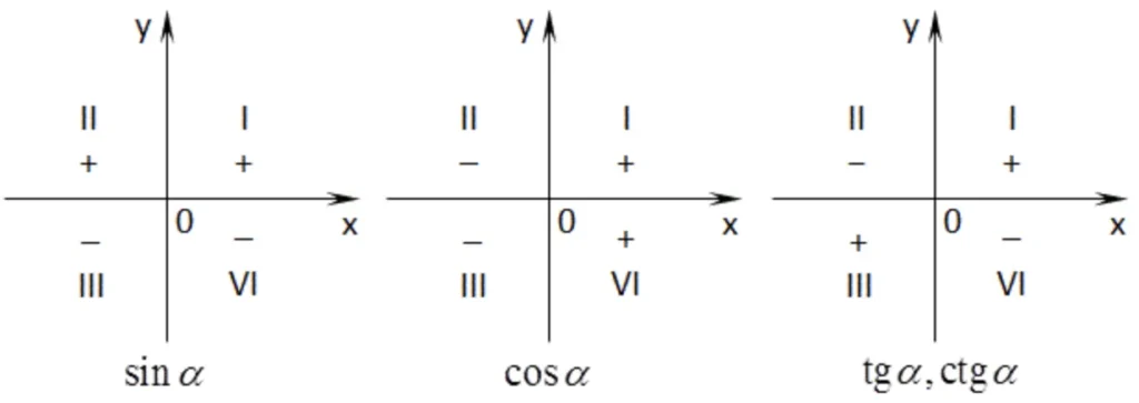 | $$\text{ctg}\, x$$ | $$-\text{ctg}\,\alpha$$ | $$\text{tg}\,\alpha$$ | $$-\text{tg}\,\alpha$$ | $$-\text{ctg}\,\alpha$$ | $$\text{ctg}\,\alpha$$ | $$\text{tg}\,\alpha$$ | $$-\text{tg}\,\alpha$$ | $$-\text{ctg}\,\alpha$$ | $$\text{ctg}\,\alpha$$ |