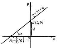 Коефіцієнти $$k$$ і $$b$$ в рівнянні прямої мають наочне геометричне тлумачення. Значення коефіцієнта $$k$$ дорівнює тангенсу кута $$\alpha$$ нахилу прямої до осі абсцис (кут відраховується від позитивного напрямку осі абсцис проти годинникової стрілки). Значення коефіцієнта $$b$$ визначає відрізок, що відсікається на осі ординат графіком лінійної функції $$y=kx+b.$$