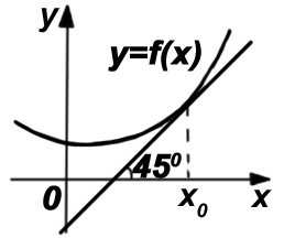 Кількість балів: 1Дотична, проведена до графіка функції $$y=f(x)$$ в точці з абсцисою $$x_0,$$ нахилена до додатного напряму осі $$Ox$$ під кутом $$45^{\circ}$$ (див. рисунок). Знайдіть $$f'(x_0).$$