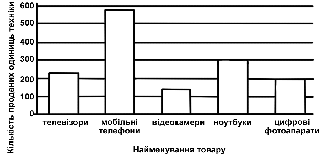 Використовуючи дані діаграми, доберіть таке закінчення речення, щоб утворилося правильне твердження: “Більше ніж цифрових фотоапаратів, але менше ніж мобільних телефонів, у цьому супермаркеті продано…”.