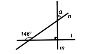 Кількість балів: 1Пряма $$n$$ перетинає перпендикулярні прямі $$l$$ і $$m$$ (див. рисунок). Визначте градусну міру кута $$a$$.