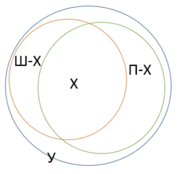 Використовувати кола Ейлера для наочного зображення підмножин. Скласти та розв'язати рівняння. Множину всіх учнів у класі позначимо літерою У (блакитний). Множину учнів, які вміють плавати, позначимо літерою П (зелений). Вона є підмножиною множини У. Множину учнів, які грають у шахи позначимо літерою Ш (помаранчевий). Вона теж є підмножиною множини У. Перетин множин П і Ш позначимо буквою Х - множина дітей, які вміють і плавати, і грати в шахи. - Завдання 11 з 15