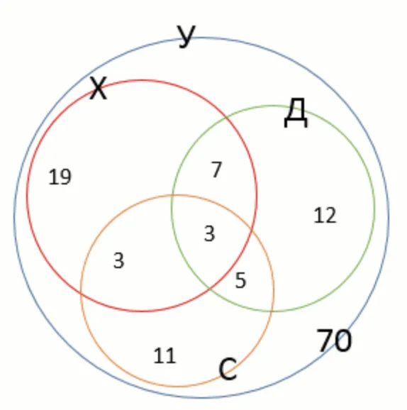 У ліцеї навчається 70 учнів, з них 27 записалося в драмгурток, 32 співають у хорі, 22 захоплюються спортом. Драмгурток відвідують 10 учнів, які також займаються в хорі, у хорі співає 6 спортсменів, у драмгуртку займається 8 спортсменів, 3 спортсмени відвідують і драмгурток, і хор. Скільки дітей не співає в хорі, не захоплюється спортом і не займається в драмгуртку?