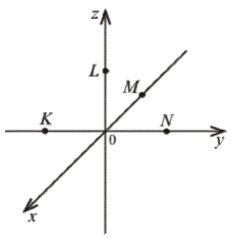 Кількість балів: 4На рисунку зображено прямокутну систему координат у просторі, на осях якої позначено точки $$K,L,M,N.$$ Установіть відповідність між точками $$K,L,M,N$$ та їхніми можливими координатами.