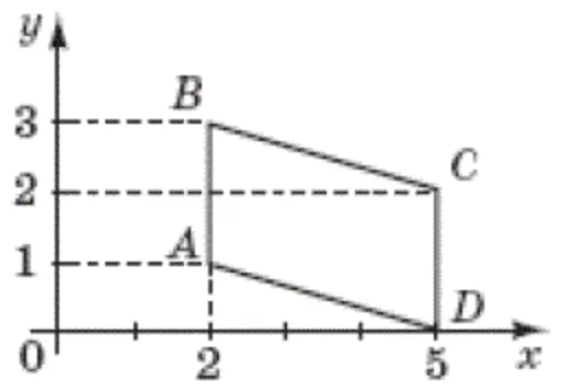 Кількість балів: 1Обчисліть площу чотирикутника $$ABCD$$ (див. рисунок), сторони якого паралельні вісі $$Oy.$$