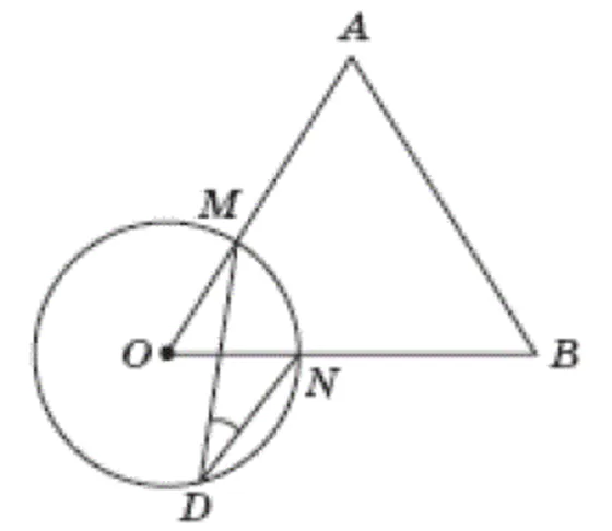 Кількість балів: 1На рисунку зображено коло з центром у точці О і рівносторонній трикутник АОВ, що перетинає коло в точках M і N. Точка D належить колу. Знайдіть градусну міру кута MDN.