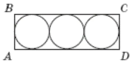 Кількість балів: 1У прямокутник ABCD вписано три круги одного й того самого радіуса (див. рисунок). Визначте довжину сторони BC, якщо загальна площа кругів дорівнює $$3\pi.$$