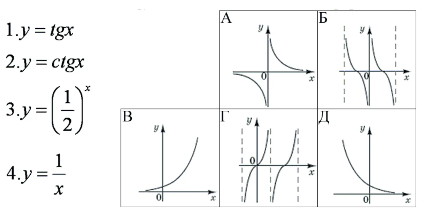 Кількість балів: 4Установіть відповідність між функціями (1-4) та ескізами їхніх графіків (А-Д).