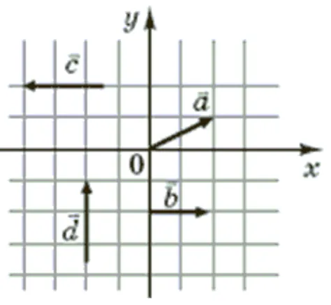 Кількість балів: 4На рисунку зображено вектори $$\vec{a},\vec{b},\vec{c},\vec{d}$$ у прямокутній системі координат. Установіть відповідність між парою векторів і твердженнями, що є правильним для цієї пари.