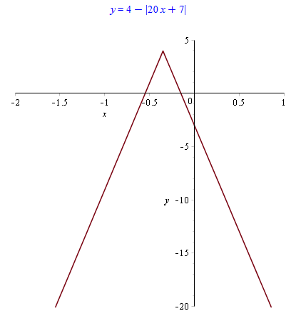 $$y=4-|20x+7|=\left[\begin{matrix} 4-(20x+7), 20x+7\geqslant 0\\ \\ 4-(-20x-7), 20x+7< 0 \end{matrix}\right.=\left[\begin{matrix} -20x-3, x\geqslant -\frac{7}{20}\\ \\ 20x+11, x< -\frac{7}{20} \end{matrix}\right.$$