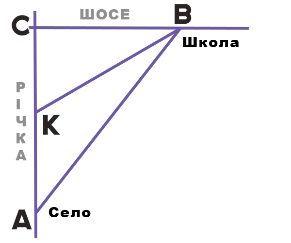 $$\triangle ABC$$: $$\angle C=90^{\circ}$$, $$AB=c$$, $$AC=b$$, $$BC=a$$. Точка $$K$$ – середина відстані від села до шосе вздовж річки, $$AK=KC=\frac{b}{2}$$, $$BK=\sqrt{a^2+(\frac{b}{2})^2}$$ – відстань від половини шляху річкою до школи (за теоремою Піфагора з прямокутного трикутника $$\triangle KCB$$).