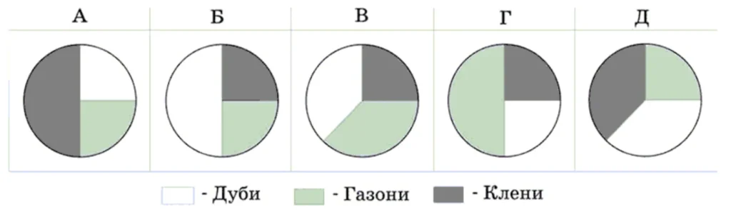 Під посадку кленів відвели 25% усієї площі – це $$\frac{1}{4}$$ (або Б, або В, або Г).