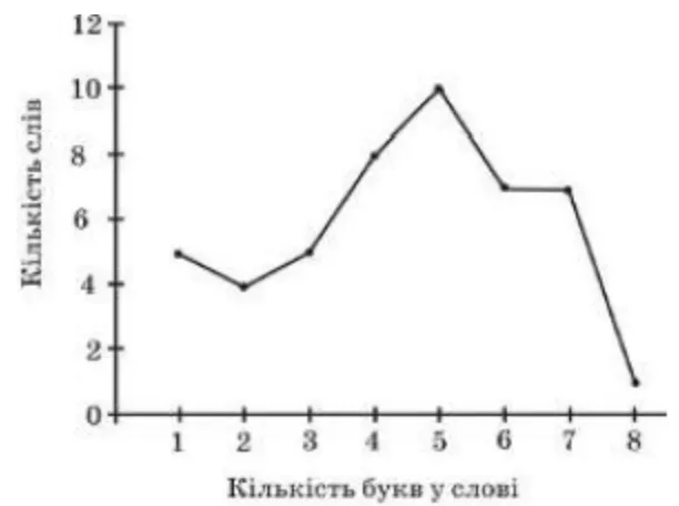 З полігона частот, зображеного на рисунку, видно, що найчастіше трапляються слова (10 слів), які складаються з п’яти літер, отже, мода дорівнює 5.