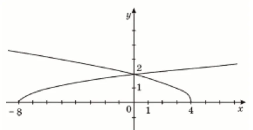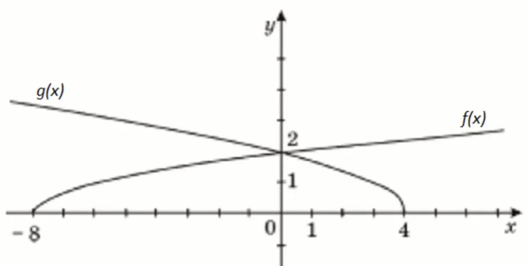 На рисунку зображено графіки функцій $$g(x)=\sqrt{4-x}$$ і $$f(x)=\frac{\sqrt{2}}{2}\sqrt{x+8}$$. Укажіть проміжок, на якому виконується нерівність $$f(x)\leqslant g(x)$$.