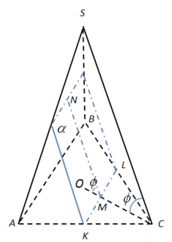 У правильній трикутній піраміді SABC з основою АВС бічне ребро вдвічі більше за сторону основи. Точки K і L є серединами ребер АС і ВС відповідно. Через пряму KL, паралельно до ребра SС, проведено площину α. Знайдіть кут ϕ між площиною α і площиною (АВС).