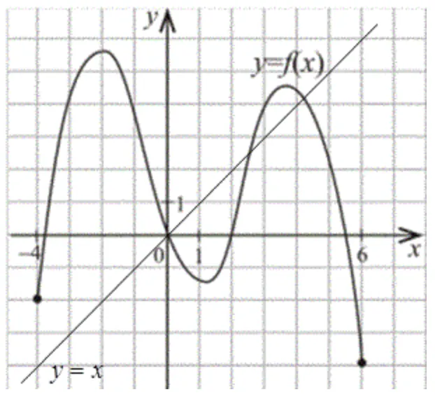 На рисунку зображено графік функції $$y=f(x),$$ яка визначена на відрізку $$[-4;6].$$ Скільки всього коренів має рівняння $$f(x)=x$$ на цьому відрізку?