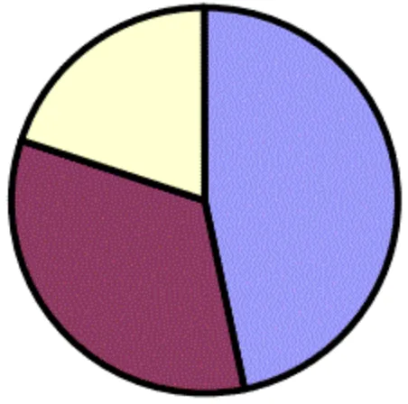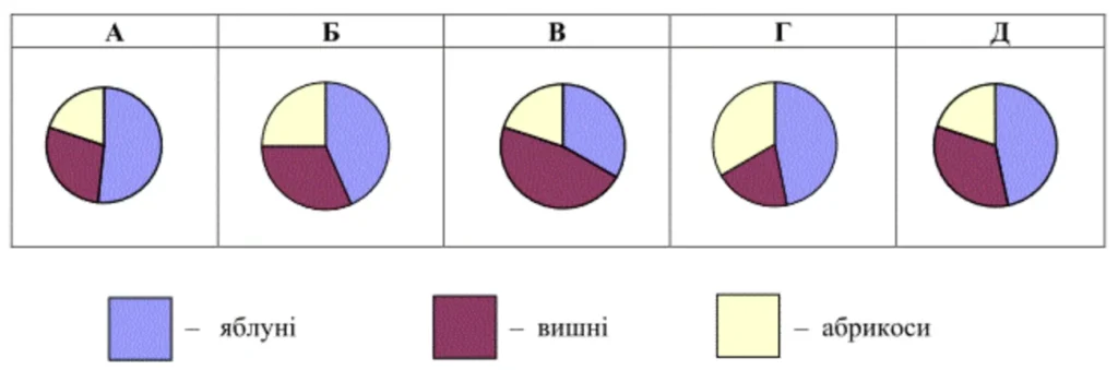 У саду ростуть 60 дерев: 28 яблунь, 20 вишень і 12 абрикос. На одній із діаграм правильно зображено розподіл дерев у саду. Укажіть цю діаграму.