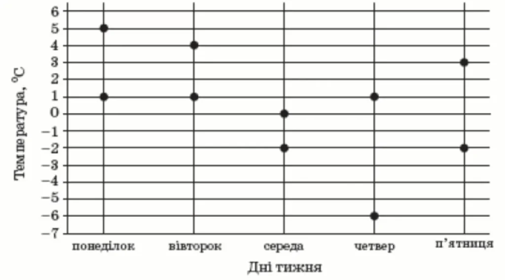 На рисунку показано жирними точками найвищу і найнижчу температури повітря кожного дня тижня з понеділка до п’ятниці в деякому місті України. По горизонталі відмічено дні тижня, а по вертикалі – температуру повітря в градусах Цельсія.