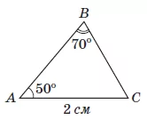 У трикутнику $$ABC$$ відомі $$AC=2$$ см, $$\angle A=50^{\circ},$$ $$\angle B=70^{\circ}$$ (див. рисунок). Визначте $$BC$$ (в см) за теоремою синусів.