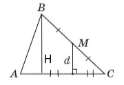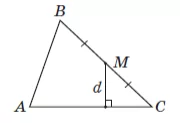У трикутнику $$ABC$$ точка $$M$$ – середина сторони $$BC,$$ $$AC=24$$ см (див. рисунок). Знайдіть відстань $$d$$ від точки $$M$$ до сторони $$AC,$$ якщо площа трикутника $$ABC$$ дорівнює 96 см2.