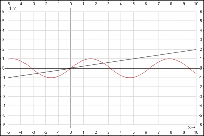 4. Пряма $$y=\frac{x}{5}$$ і синусоїда $$y=\sin x$$ мають три спільні точки, тобто відповідь Г