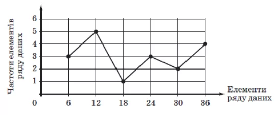На рисунку зображено полігон частот певного ряду даних, на якому за віссю абсцис позначено елементи цього ряду, а за віссю ординат – їхні частоти. Установити відповідність між характеристикою цього ряду даних та її числовим значенням.